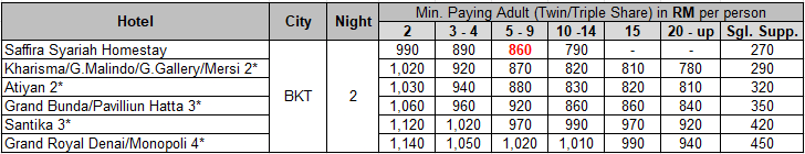 Price From | RM860 (5-9 pax) | 2N Bukittinggi | Low Season Only