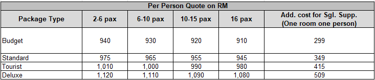 Price From | RM940 (2-6 pax) | Low Season