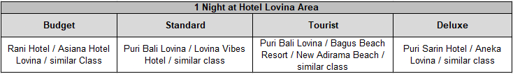 Upon arrival in Bali International Airport, our staff will meet on arrival gate by sign board of passengers name or party. After check all passengers documents our staff will transferred to the hotel for accommodation direct to Lovina the local restaurant for dinner.
